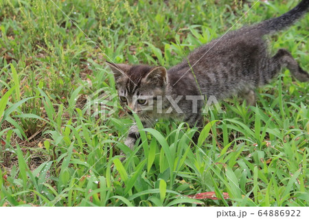 雨上がりの草むらを軽快に歩き走りだそうとするキジトラの子猫