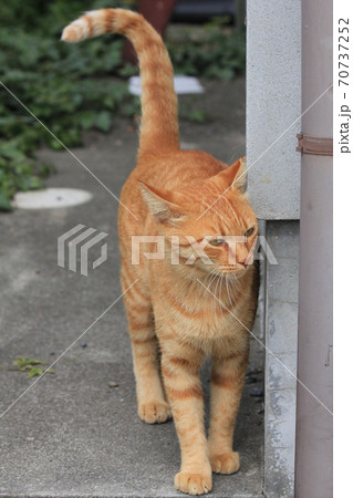 建物の角に立ち樋の隙間から様子を伺う茶トラ猫