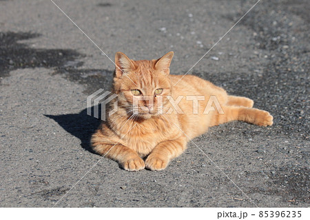 陽が射すほうを向き変形スフィンクス座りをする茶トラ猫