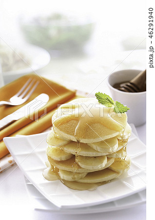 Homemade dessert, stack of pancakes with banana and topped with syrup on white dishes in morning.
