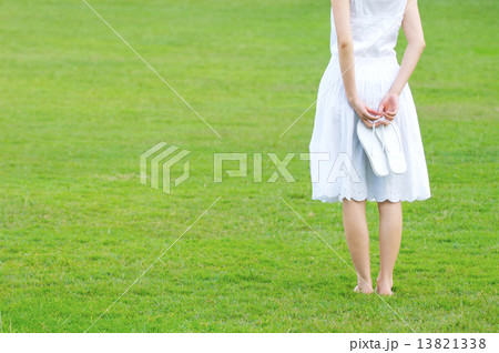 サンダルを持つ後姿の女性