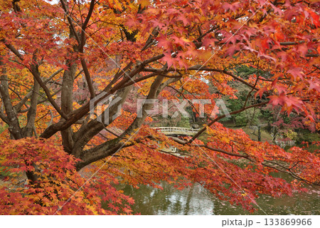 京都仙洞御所 南池のモミジと紅葉橋(京都市上京区)