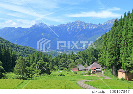 (長野県)白馬村・青鬼(あおに)集落の棚田と残雪の北アルプス