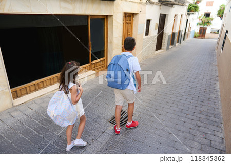 Cheerful kids with backpacks are happily walking to school in morning, feeling excited and ready for new day