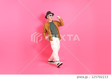 Fashion model strutting down the runway in a vibrant pink outfit, stylish pink sunglasses perched on her face, and a chic pink handbag in hand during a dazzling fashion show
