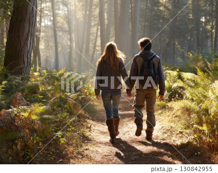 Couple walking hand in hand on sunlit forest trail surrounded by tall trees and lush green ferns, enjoying peaceful nature hike
