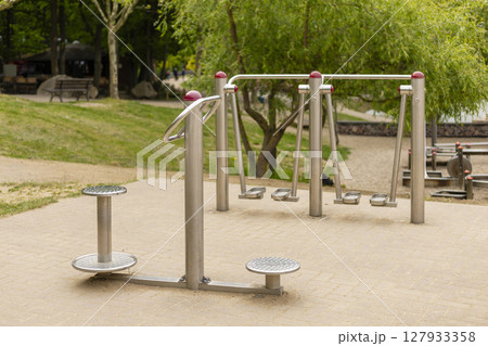 A set of outdoor fitness equipment located in a park offers various workout stations amid lush trees and pathways. This area encourages locals to engage in physical activity