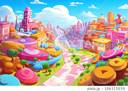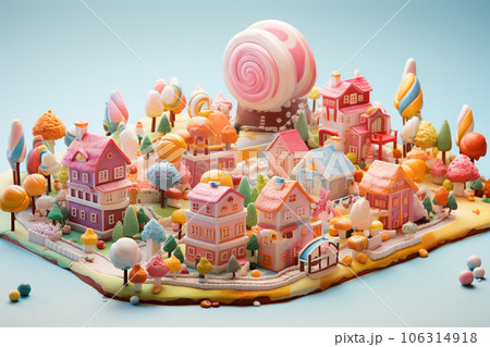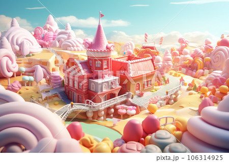 お菓子をモチーフにしたカラフルで可愛い建物が立ち並ぶメルヘンな世界。