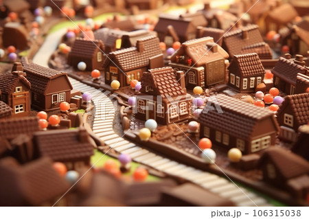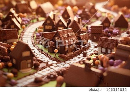 森の中にお菓子の家が立ち並ぶ幻想的な中世の街並み。メルヘンな世界。