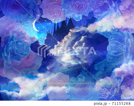薔薇のフレームの中の雲と満月と夜空の風景画ファンタジーイラスト