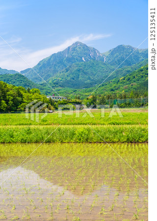 田植えを終えた御在所岳山麓の田園地帯(三重県菰野町)