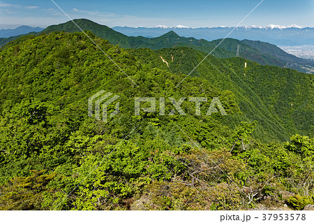 本社ヶ丸稜線から見る新緑の御坂山地と残雪の南アルプス