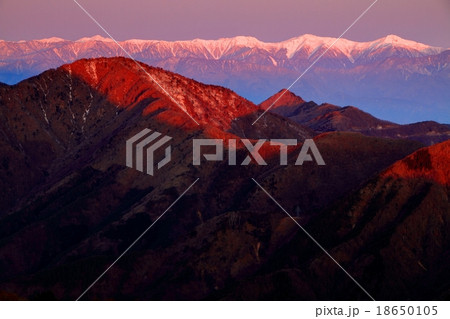 三ツ峠から見る御坂黒岳と朝焼けの白峰三山