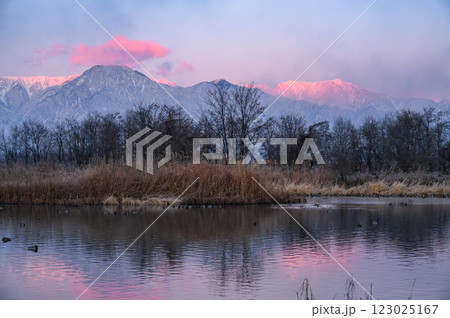 暁の御宝田遊水池:北アルプス 安曇野市明科