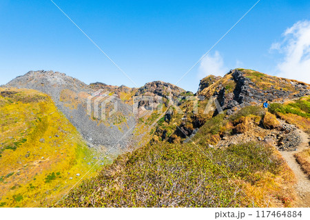 秋の鳥海山登山:外輪山コースから新山・七高山・行者岳を望む