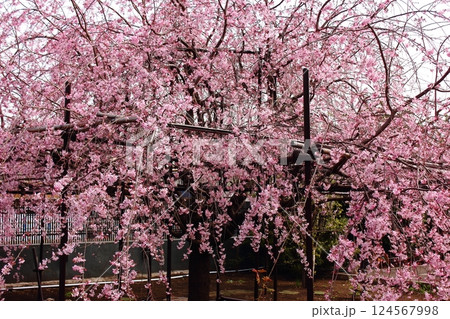 見頃を迎えた福蔵院ルンビニー庭園に咲く「三春滝桜」の(1)