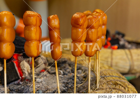 【日本】東京、高尾山の登山口で売られる炭火で焼かれるみたらし団子