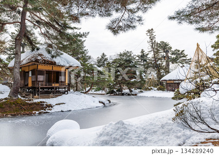 雪の御薬園の風景 会津松平氏庭園の雪景色 会津若松観光名所 福島県観光スポット 重要文化財