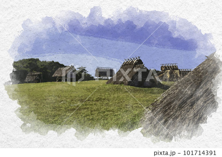 水彩画風 妻木晩田遺跡 弥生のムラ 鳥取県大山町