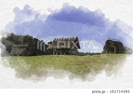 水彩画風 妻木晩田遺跡 復元土屋根竪穴住居と高床倉庫 鳥取県大山町