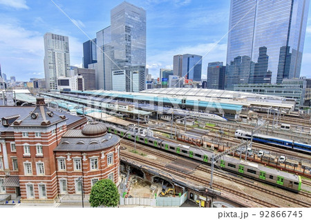 東京都 東京駅ホームを発着する電車と高層ビル群