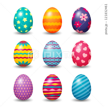 Easter Egg Isolate. Cute of cartoon ornamental Happy Easter eggs isolated on white background. Clip art set of spring holiday treat. Eggs with zig zag lines, dots, striped, with flowers, polka dot.