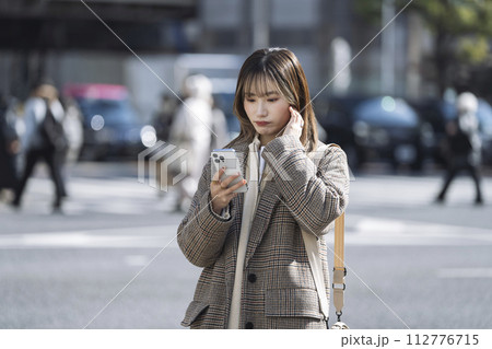 街中でスマートフォンの画面を見る20代の女性