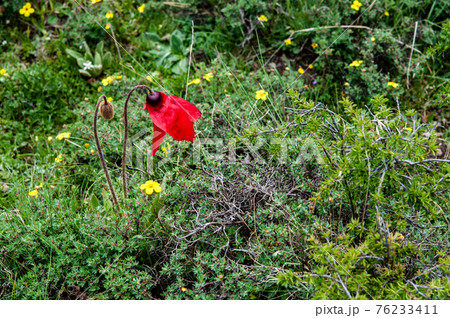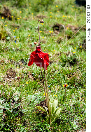 中国青海省東部 徳啄山峠に咲く赤いケシ メコノプシス・プニケア
