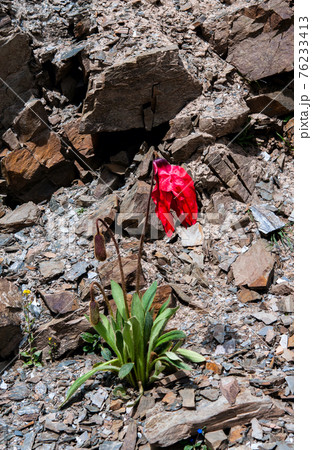 中国青海省東部 徳啄山峠に咲く赤いケシ メコノプシス・プニケア風景、山岳、高山、ガレ場、植物、高山植