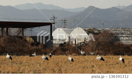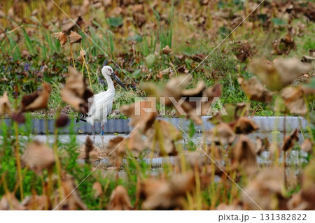 青く広い空の下、レンコン畑で佇むコウノトリのペア