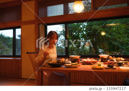 旅館の夕食時間|窓辺でくつろぐ食事風景