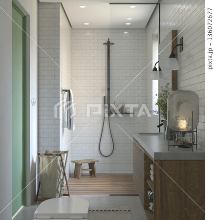 Modern bathroom interior with shower and wooden vanity. Vertical 3d render of home design