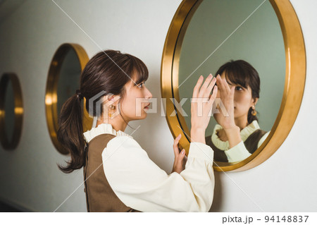三面鏡に映る女性の後ろ姿 鏡の中の自分
