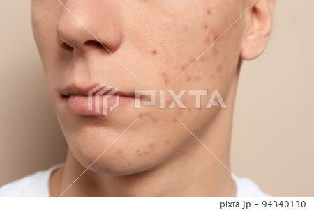 Teen guy with acne problem on beige background, closeup