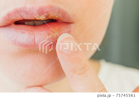 Close up of girl lips affected by herpes. Treatment of herpes infection and virus. Part of young woman face with finger touching pain on lips with herpes affected. Beauty dermatology concept.