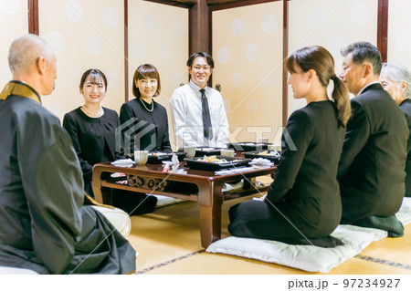 僧侶と遺族の法事・お葬式シーン(食事・笑顔)