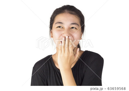 Asian woman bring one hand to cover the mouth and emotion laugh