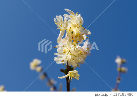 スイカズラの白と黄色の花(クローズアップ・自然光)