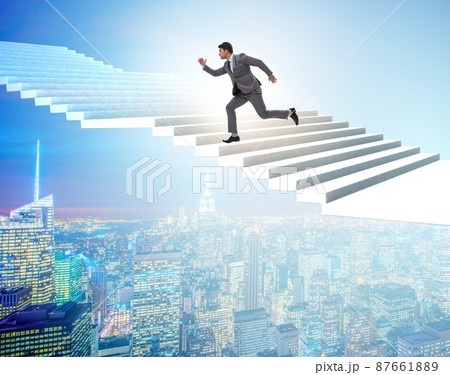 Businessman climbing career ladder over city