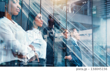 People stand in a line at an office building during the day with glass reflections showing their serious expressions and surroundings