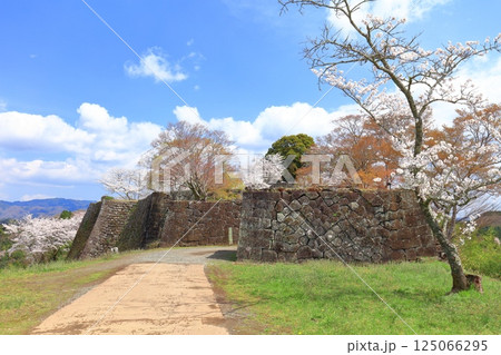 【大分県】晴天の岡城 西中仕切跡と満開の桜