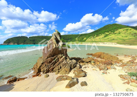 静岡県 下田市 朝の 白浜大浜海水浴場と大明神岩 赤鳥居