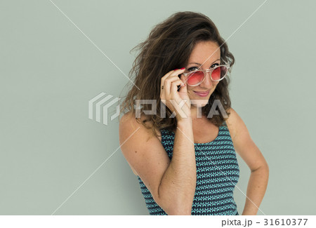 Adult Woman Wearing Sunglasses Cheerful Studio Portrait