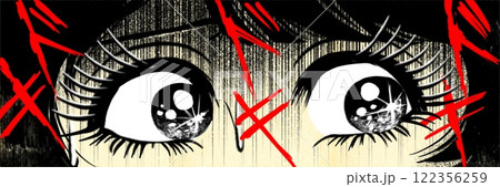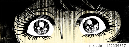 動揺して怯える少女の昭和ホラー漫画風ヘッダーイラスト