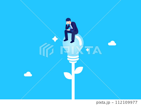 電球を浮かべてアイデアを考えるビジネスマン。ベクターイラスト