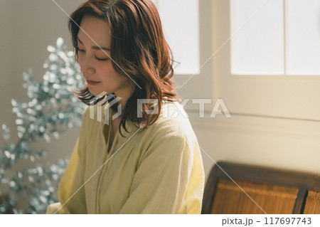 田舎のウッドデッキでワーケーション(リモートワーク)をしながら思いを馳せる日本人女性 コピースペース