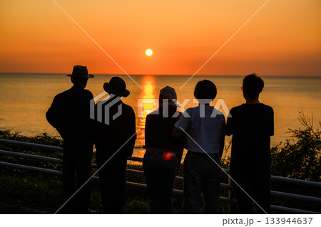 夕焼けでオレンジ色に染まる空と海、秋の逗子海岸から見る富士山と江ノ島