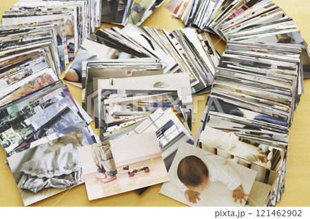 テーブルの上に重ねてて置かれたたくさんの写真プリント