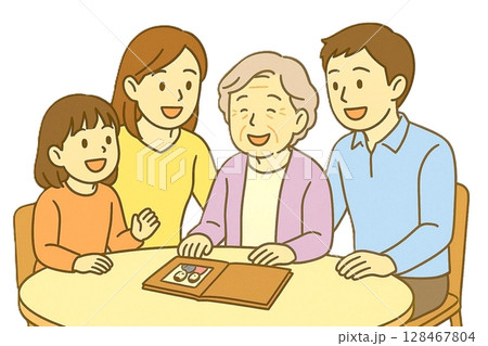 高齢の祖母と家族がアルバムを囲んで談笑するイラスト
