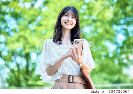 新緑の前でスマートフォンを操作するビジネスウーマン